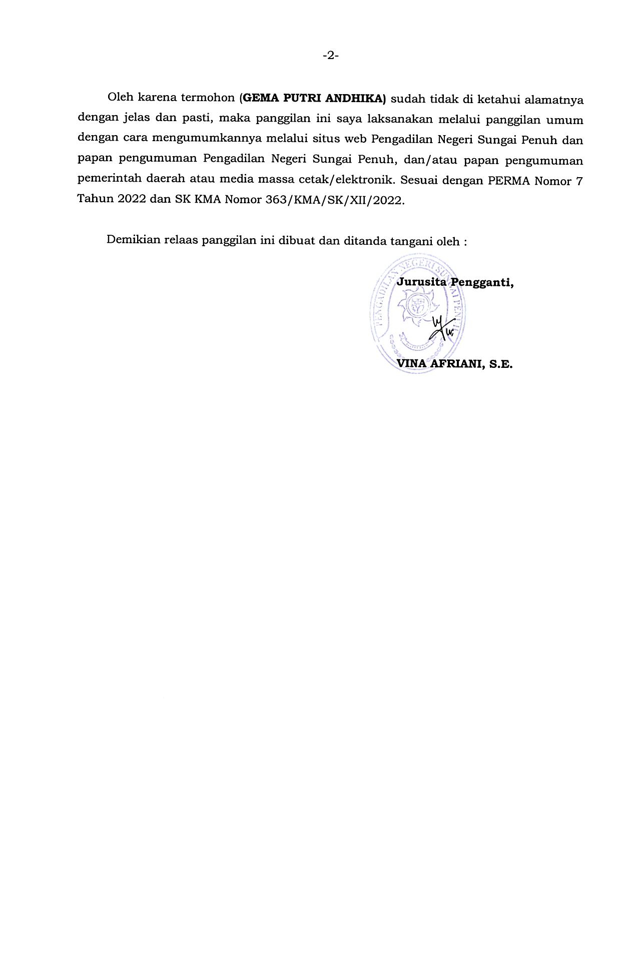 Relaas Panggilan Sidang untuk Termohon An. GEMA PUTRI ANDHIKA dalam perkara No. 21/Pdt.G/2023/PN Spn kami sampaikan melalui panggilan umum berupa situs Web, Facebook dan Instagram Pengadilan Negeri Sungai Penuh dikarenakan Termohon sudah tidak diketahui alamatnya dengan jelas dan pasti, sesuai dengan PERMA Nomor 7 Tahun 2022 dan SK KMA Nomor 363/KMA/SK/XII/2022