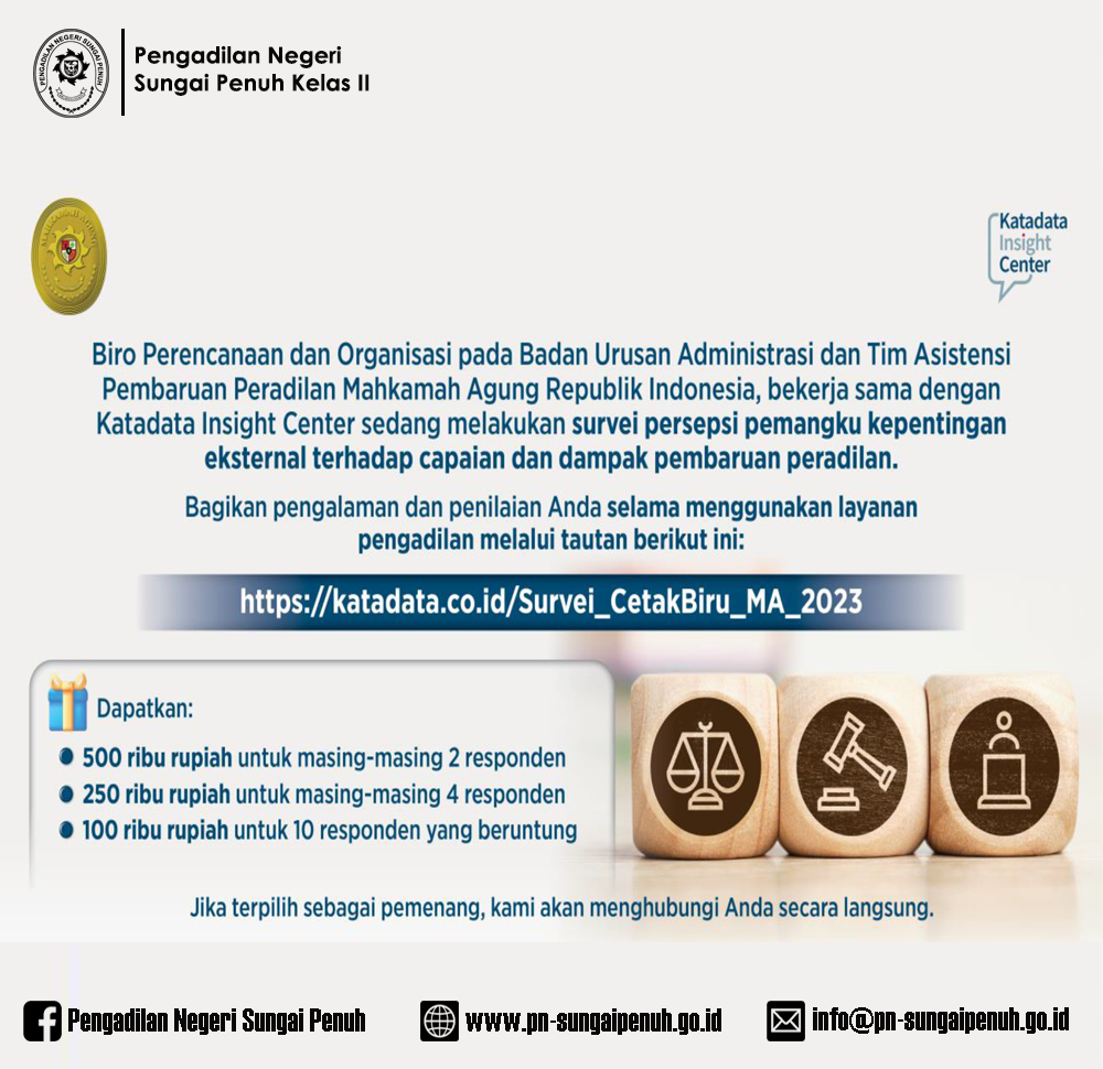 Untuk mencapai evaluasi Cetak Biru Peradilan 2010-2035 dalam rangka penyusunan rancangan rencana strategis lembaga serta menentukan agenda prioritas pembaruan untuk jangka menengah, Mahkamah Agung RI bekerja sama dengan Katadata Insight Center untuk melaksanakan survei persepsi pemangku kepentingan eksternal terhadap capaian dan dampak pembaruan peradilan.