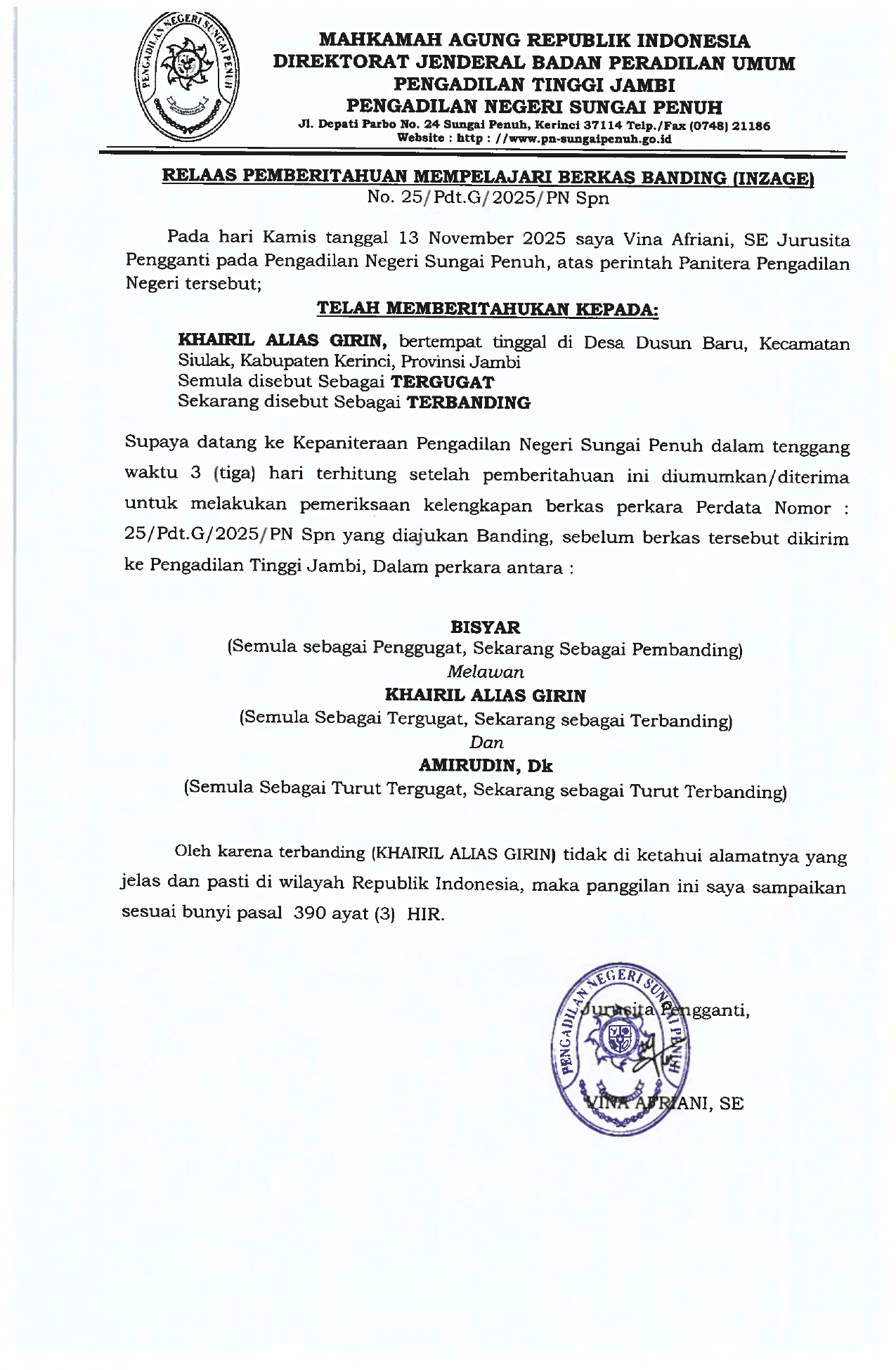 13 November 2025 Panggilan Pemeriksaan Berkas Banding Perkara Nomor 25/Pdt.G/2025/PN.SPN on Kamis, 13 November 2025. Posted in Pengumuman Tweet