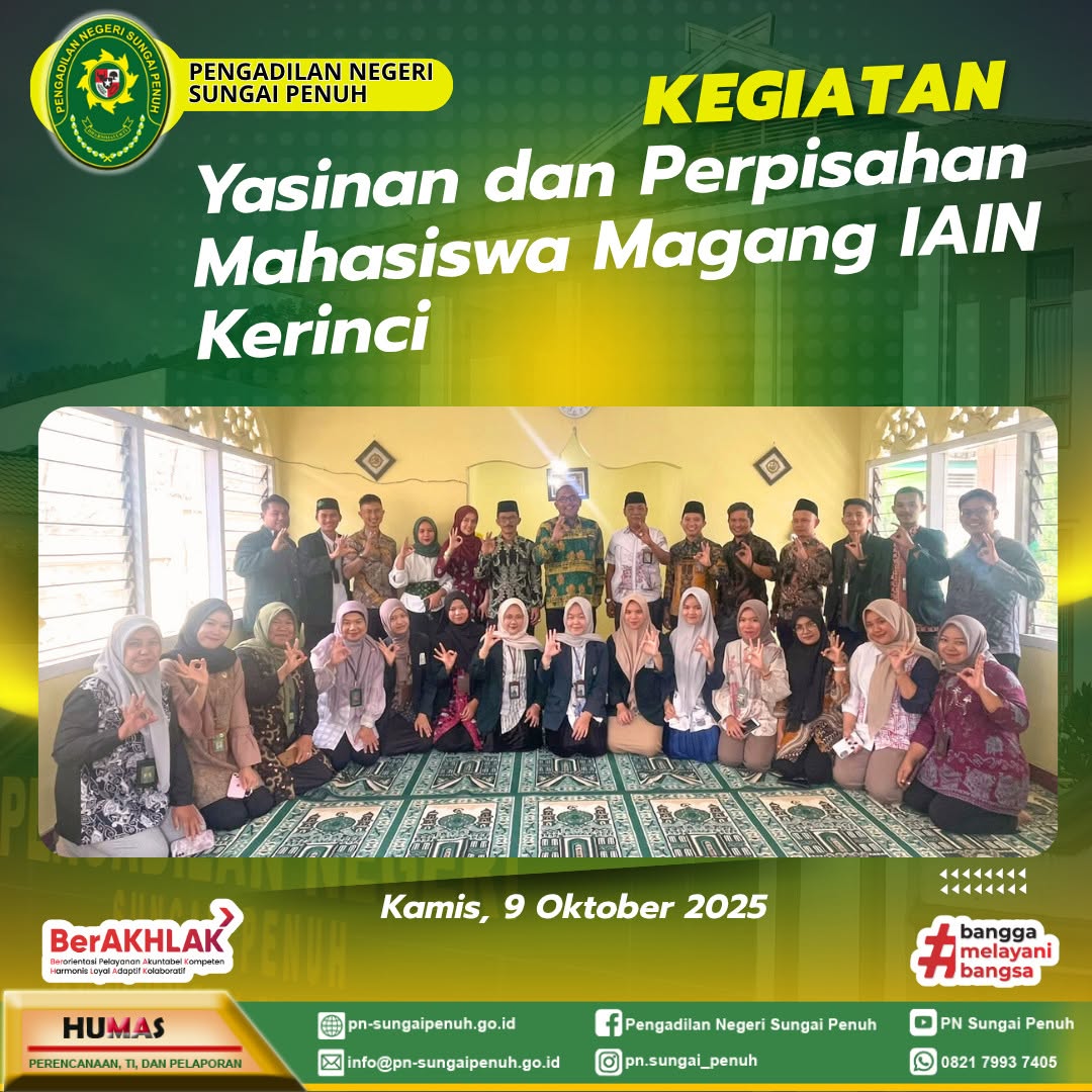 Seluruh umat muslim Pengadilan Negeri Sungai Penuh mengikuti acara Yasinan yang dilaksanakan di ruang mushala Al-Ikhlas Pengadilan Negeri Sungai Penuh.