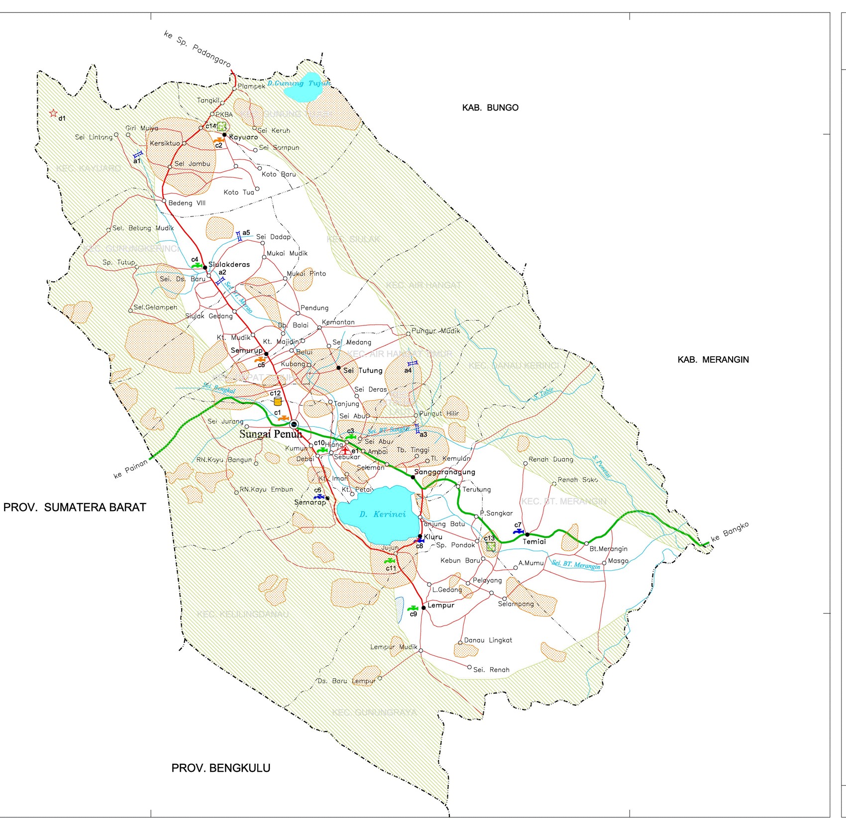 1. Kota Sungai Penuh dengan luas wilayah + 366,4 km2 yang terdiri dari 8 kecamatan, 4 Kelurahan, dan 65 Desa